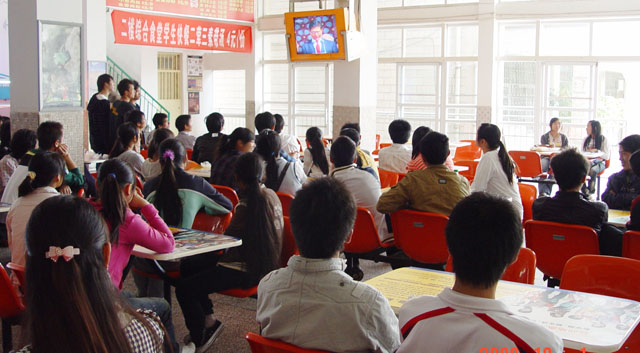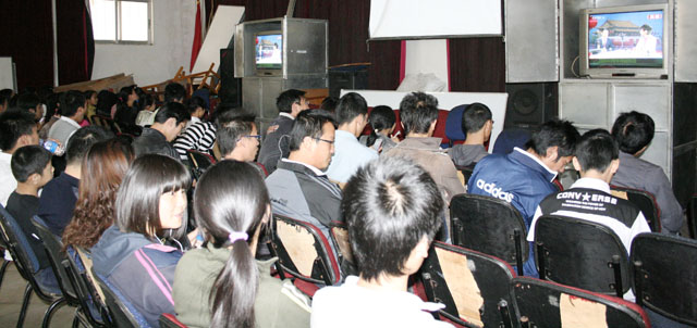 学院共协调了34台电视、提供了13个场所供学生观看直播。宣传部、各校区综合办、团委、饮食中心等部门的负责人和干部到场检查了解了收看情况。