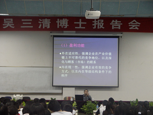 报告会上,吴博士从盈利功能、政治功能、社会功能三个方面为同学们详细地阐述了德鲁克主义的内涵、目标管理法,以及为管理学做出的巨大贡献。特别是在情绪智能方面吴博士以风趣幽默的语言、形象生动的表述,系统地阐述了何为情绪智能、怎样提升情绪智能以及如何领导自己等问题,给我院师生上了一堂生动而精彩的管理课,让听众有了深刻的启迪。同学们在笑声中了解、学习到了德鲁克理论之于企业的意义,在报告会进行的整个过程中掌声不断、笑语连连。