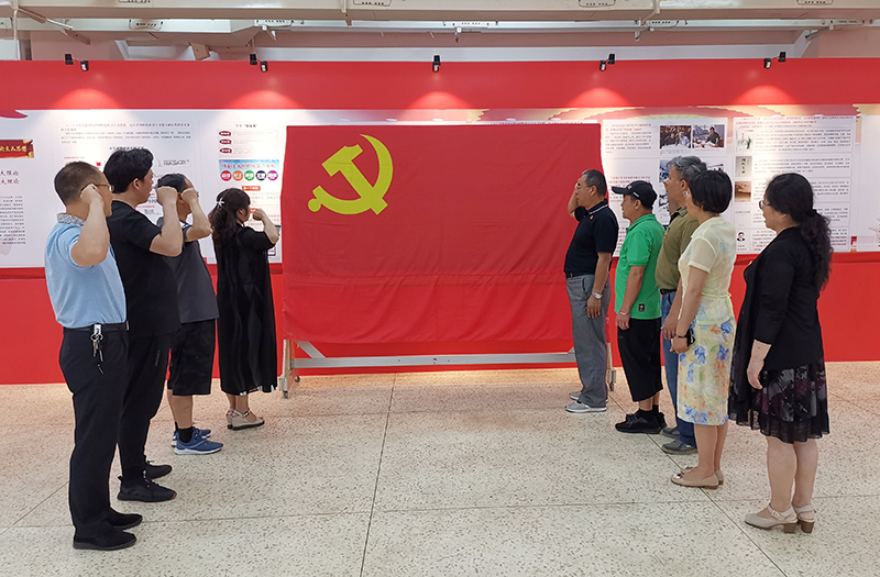 在永利集团3044官网欢迎您图书馆“习近平新时代中国特色社会主义思想学习园地”,全体党员参观了“真理之光照未来”主题展览。参观学习过程中,党员们在图书馆李静老师带领下,了解了习近平新时代中国特色社会主义思想理论渊源,创立发展、主要内容和历史地位。随后,面对鲜红的党旗全体党员重温了入党誓词。